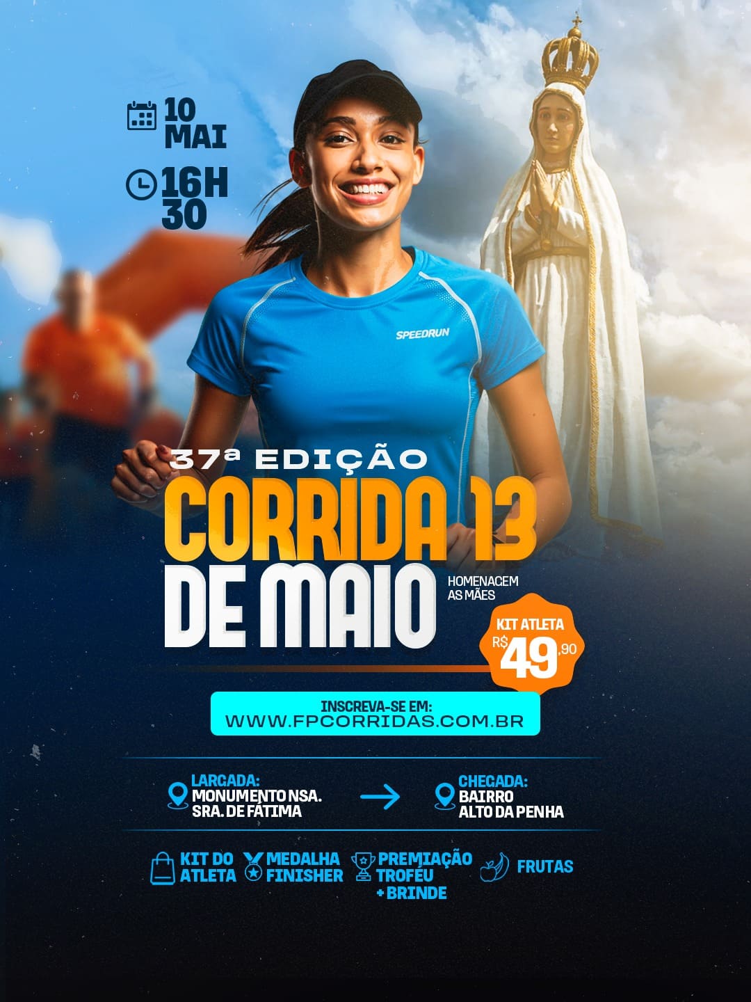 Valor inscrição: R$ 49,90 + 1kg de alimento não perecível Dia do evento: 10/05/2026 Inscrições: 20/04/2026 - 06/05/2026